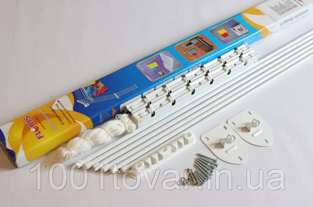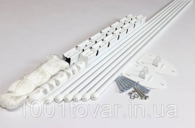 Міцний синтетичний шнур, кронштейни для кріплення на стіну, ролики з поліпропілену, які усувають дефект піщання, шість металевих трубок опускаються за допомогою мотузки, потім вішається білизну, і трубки з білизною піднімаються на максимальну висоту. Трубки піднімаються окремо, незалежно один від одного.