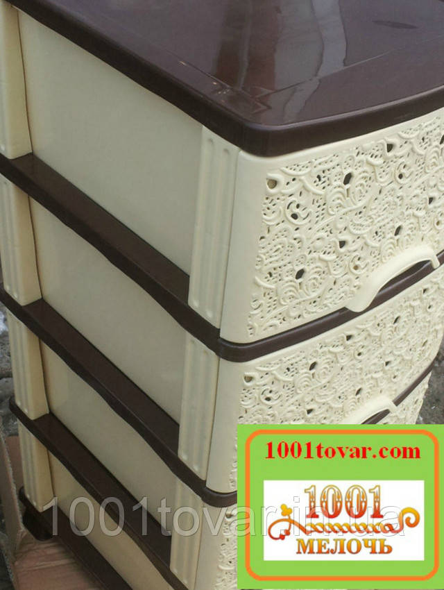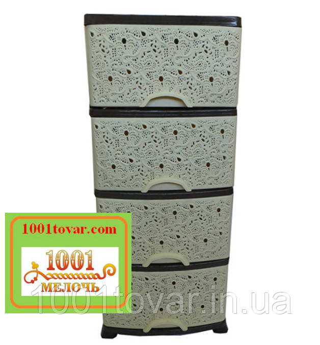 Пластиковий Ажурний комод для зберігання одягу, постільної приналежності, іграшок, та інших потрібних речей, виготовлений з міцного пластику. Комод має чотири висувних містких скриньки, які легко відкриваються, так як під кожним ящиків розташовані коліщатка, з допомогою чого ящики плавно відкриваються і закриваються.