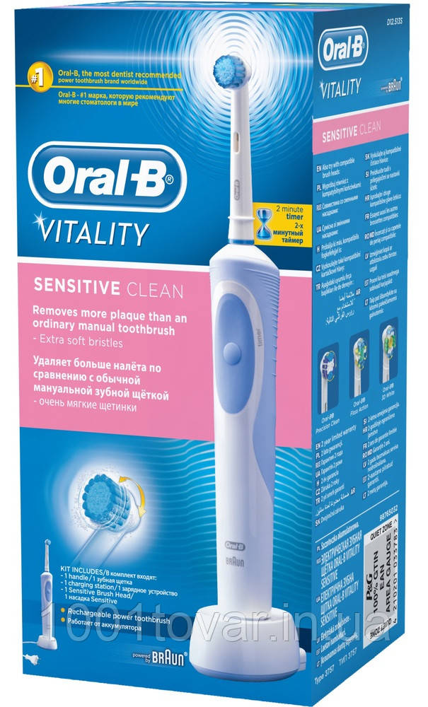 Електрична щітка Oral-B Vitality Sensitive чистить зуби ретельніше ніж звичайна зубна щітка завдяки насадці з більш м'якою щетиною. Вона володіє всіма позитивними характеристиками: міцність, точність, чистота плюс м'які щетинки. Насадка охоплює кожен зуб окремо для зняття нальоту і дбайливого видалення потемніння емалі. М'яке очищення для чутливих ясен. Її вбудований таймер допоможе Вам чистити зуби рівно 2 хвилини, як рекомендують стоматологи. Сумісна з усіма видами насадок (крім Sonic).
