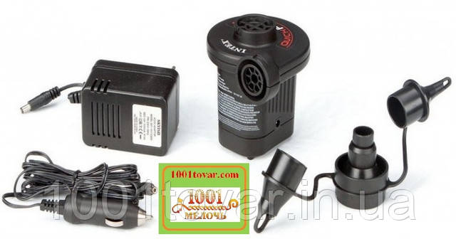 Электрический насос Intex 66632 работает как от сети 220В, так и от 12В (разъем прикуривателя в автомобиле). С электрическим насосом Intex 66632 идут в комплекте 3 насадки, которые подходят для накачивания всех надувных изделий.