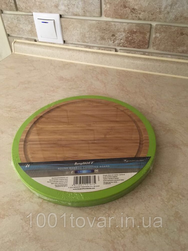 Кругла обробна бамбукова дошка з силіконовими краями Berghoff. Вона вигідно відрізняється від інших тим ,що має силіконові краю, які дозволяють їй ковзати і дуже зручно триматися в руці Не боїться вологи, не затупляет ножі, не розшаровується, при тривалому використанні не деформується. не вбирає запахи. Просочена спеціальним складом, що значно підвищує її антисептичні властивості та тривалість експлуатації